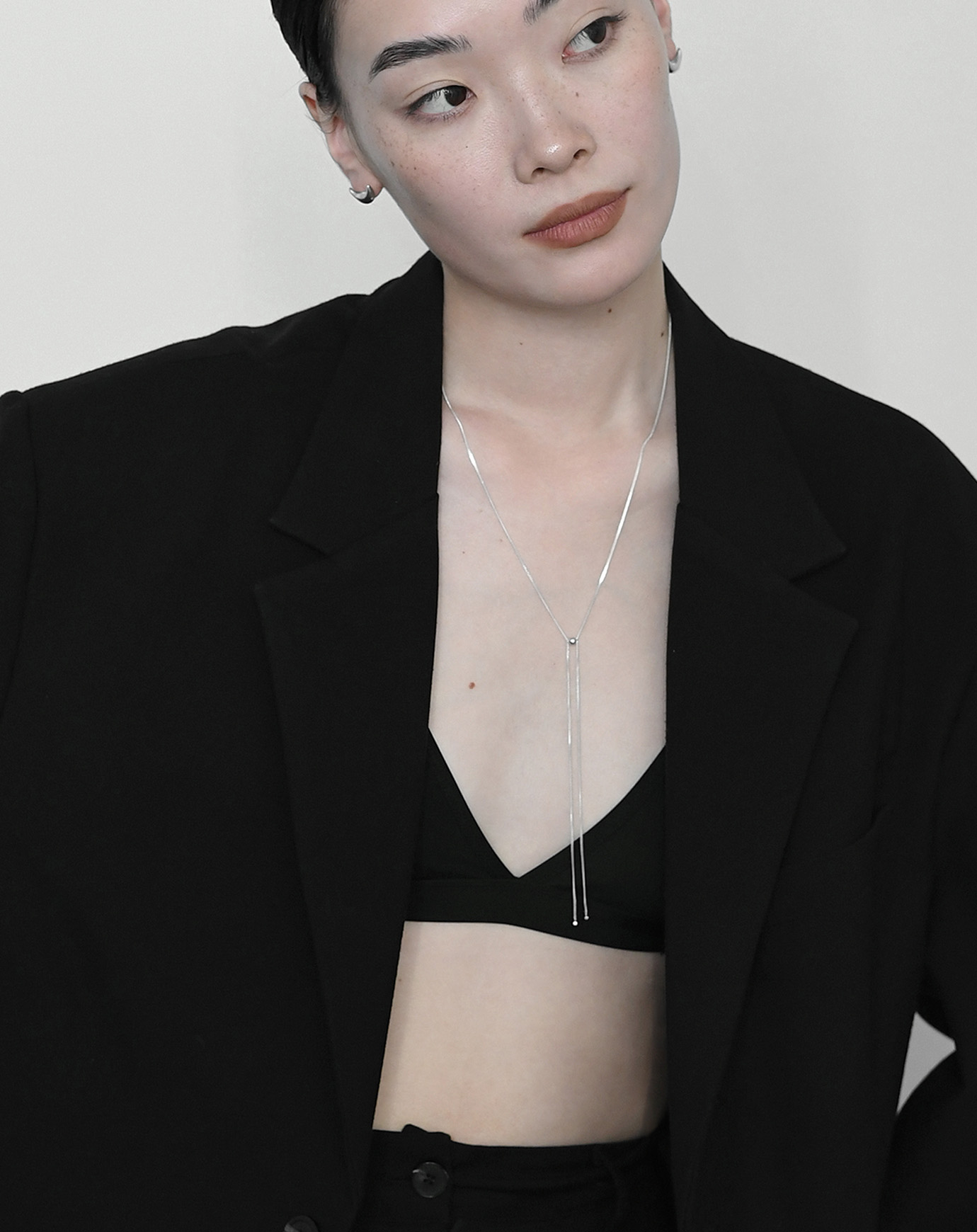 シルバーボールで長さを調整できるので、どんなコーディネートにも自然に溶け込みます。