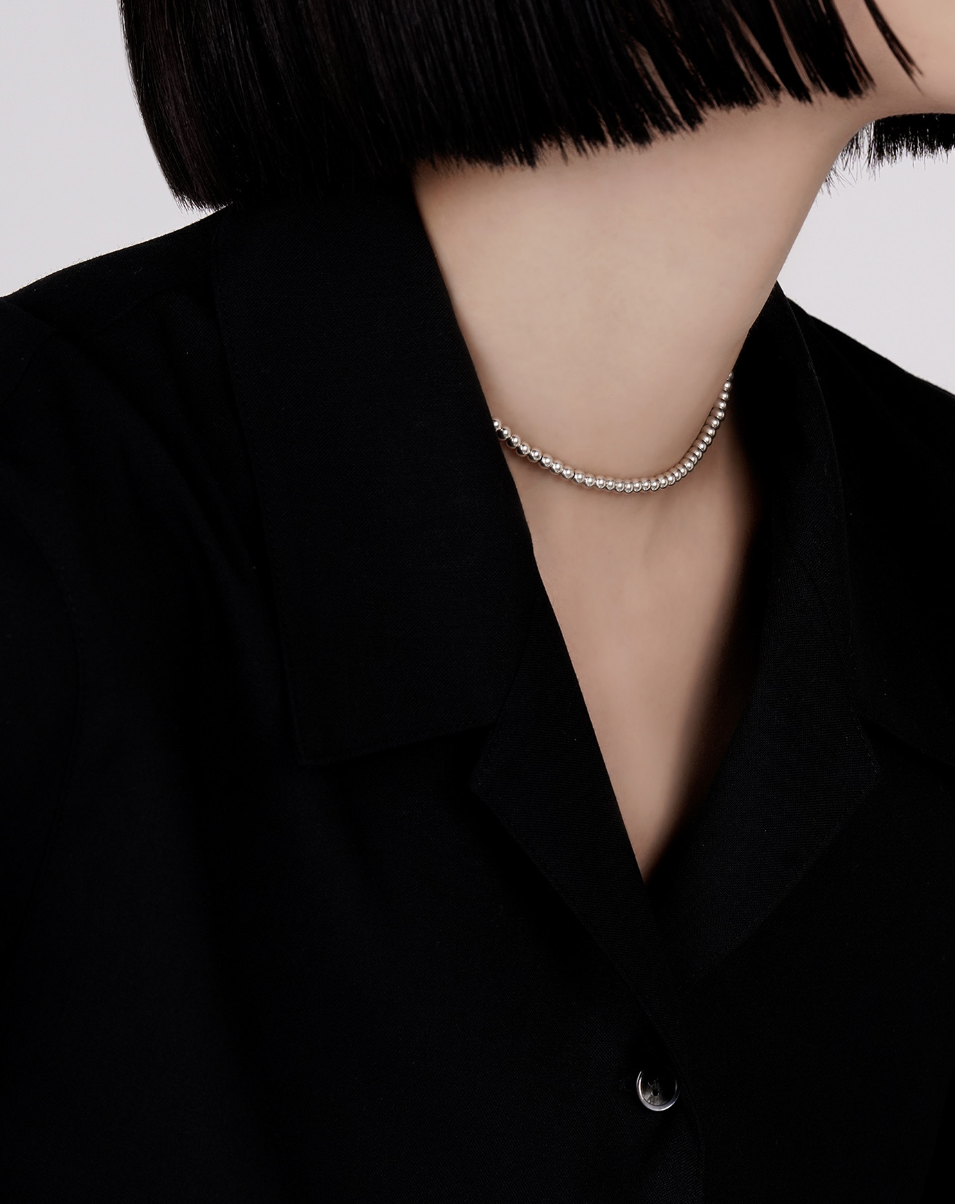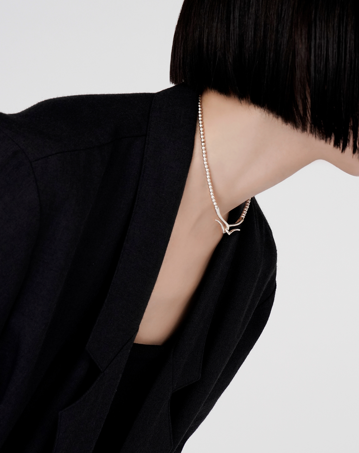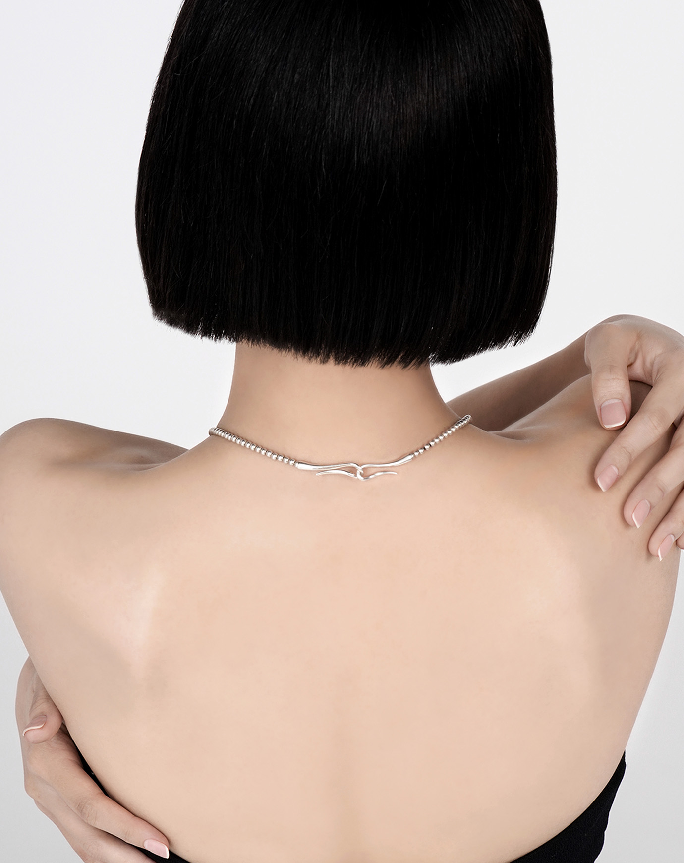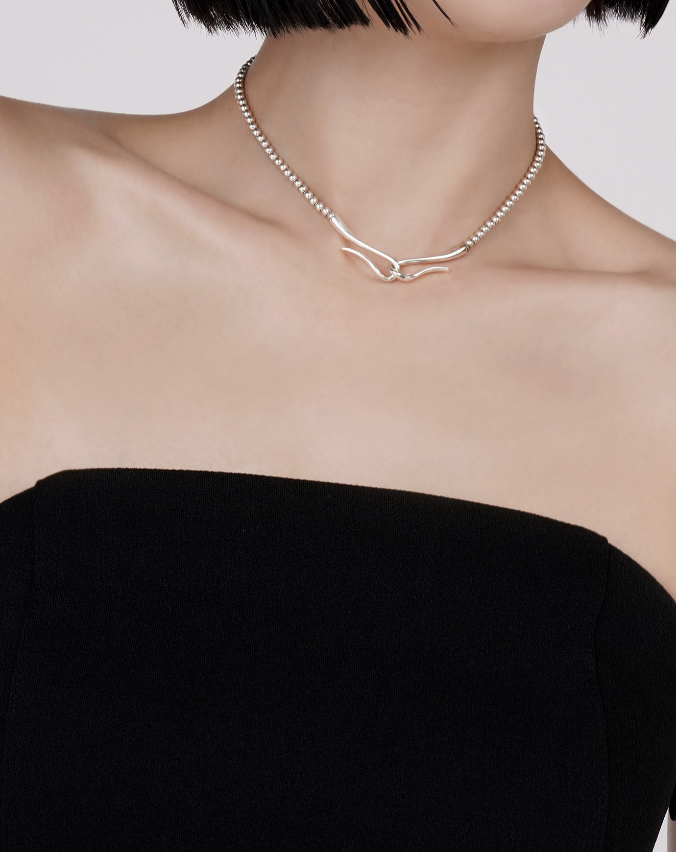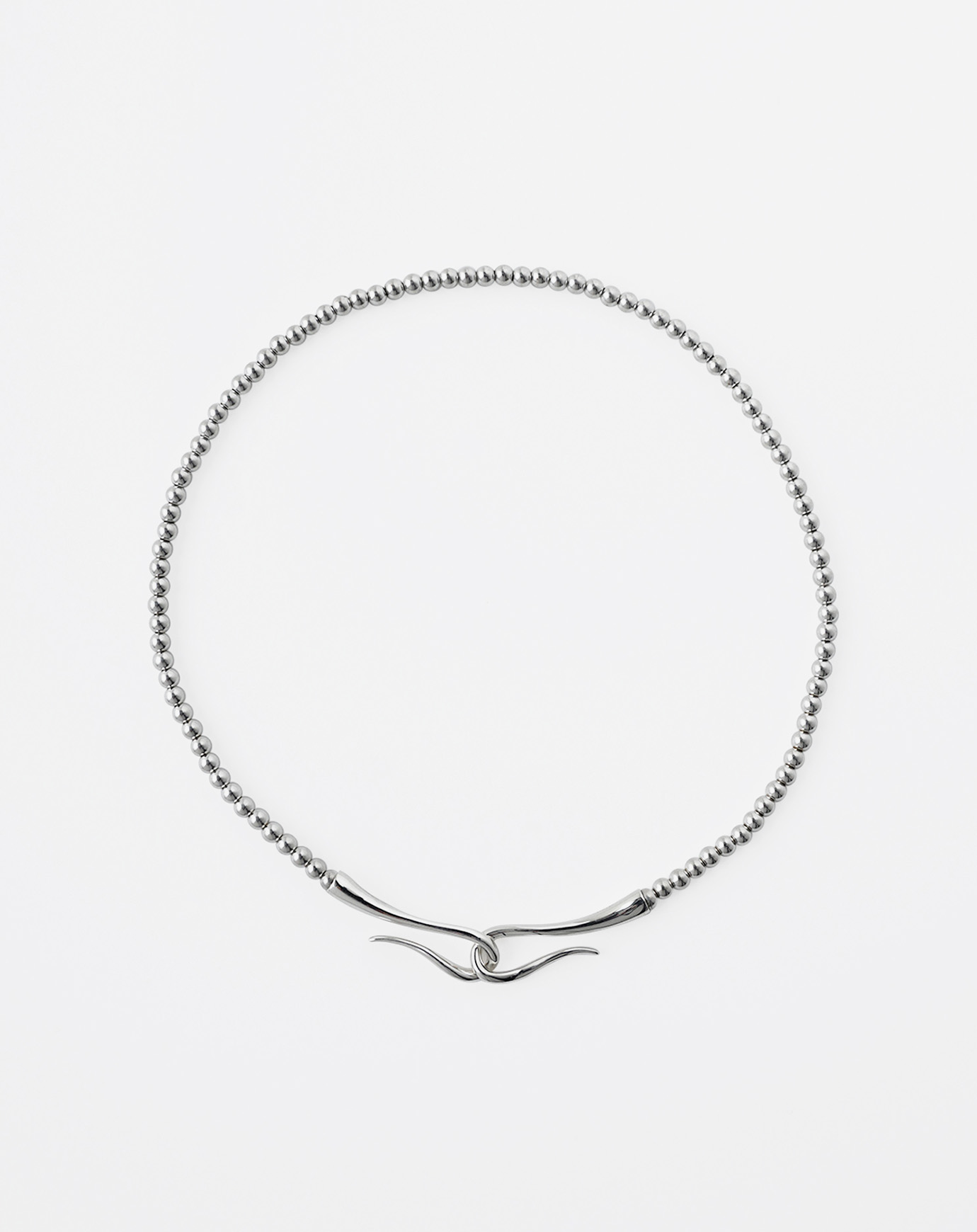 シンプルなボールのチョーカーネックレス。フック部分は牙からインスピレーションを受けており、シンプルと調和する個性があります。フック部分を前に持ってきていただいてデザインを見せるつけ方もおすすめです