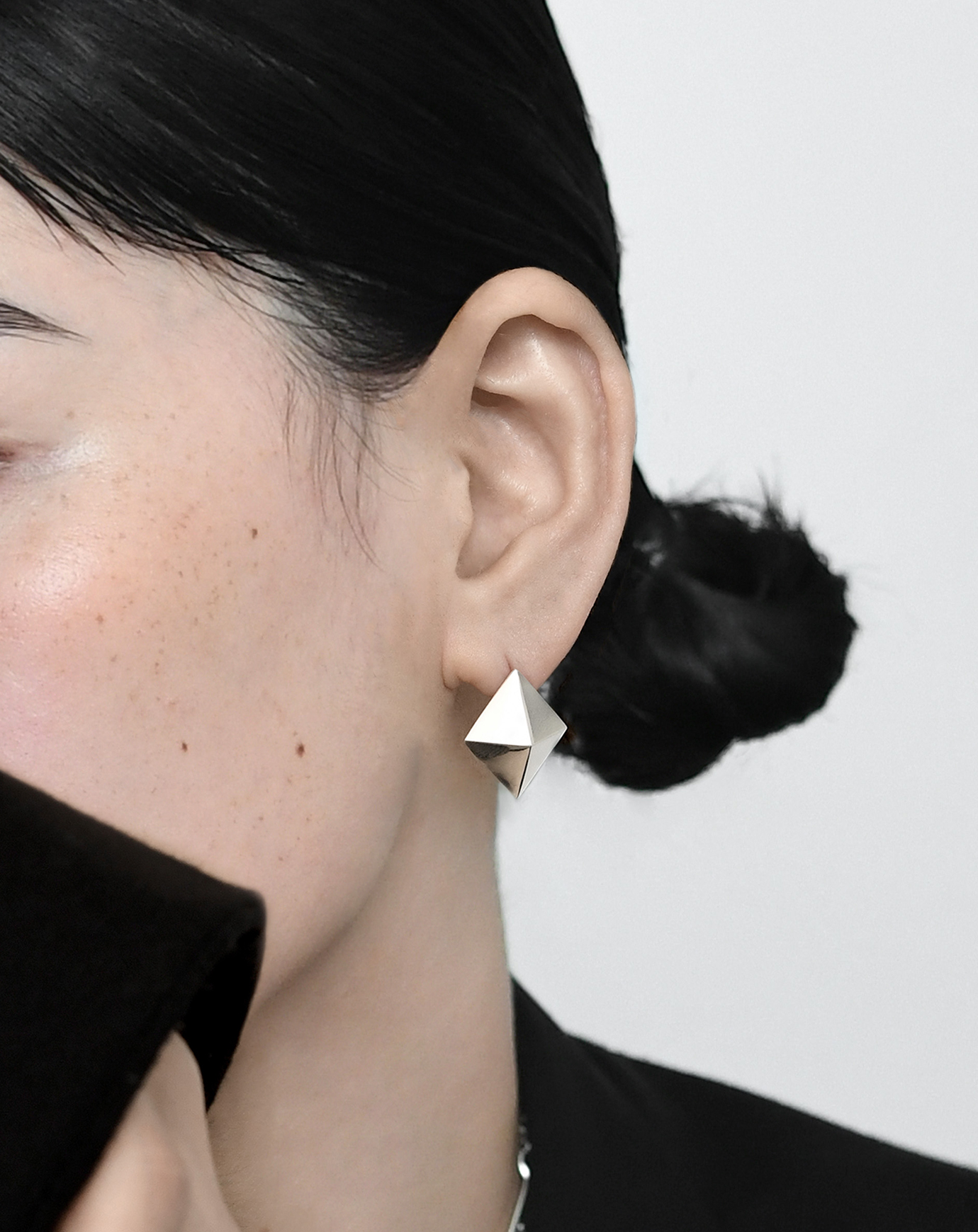 立体的なダイヤモチーフが耳元でシャープに際立つピアス。