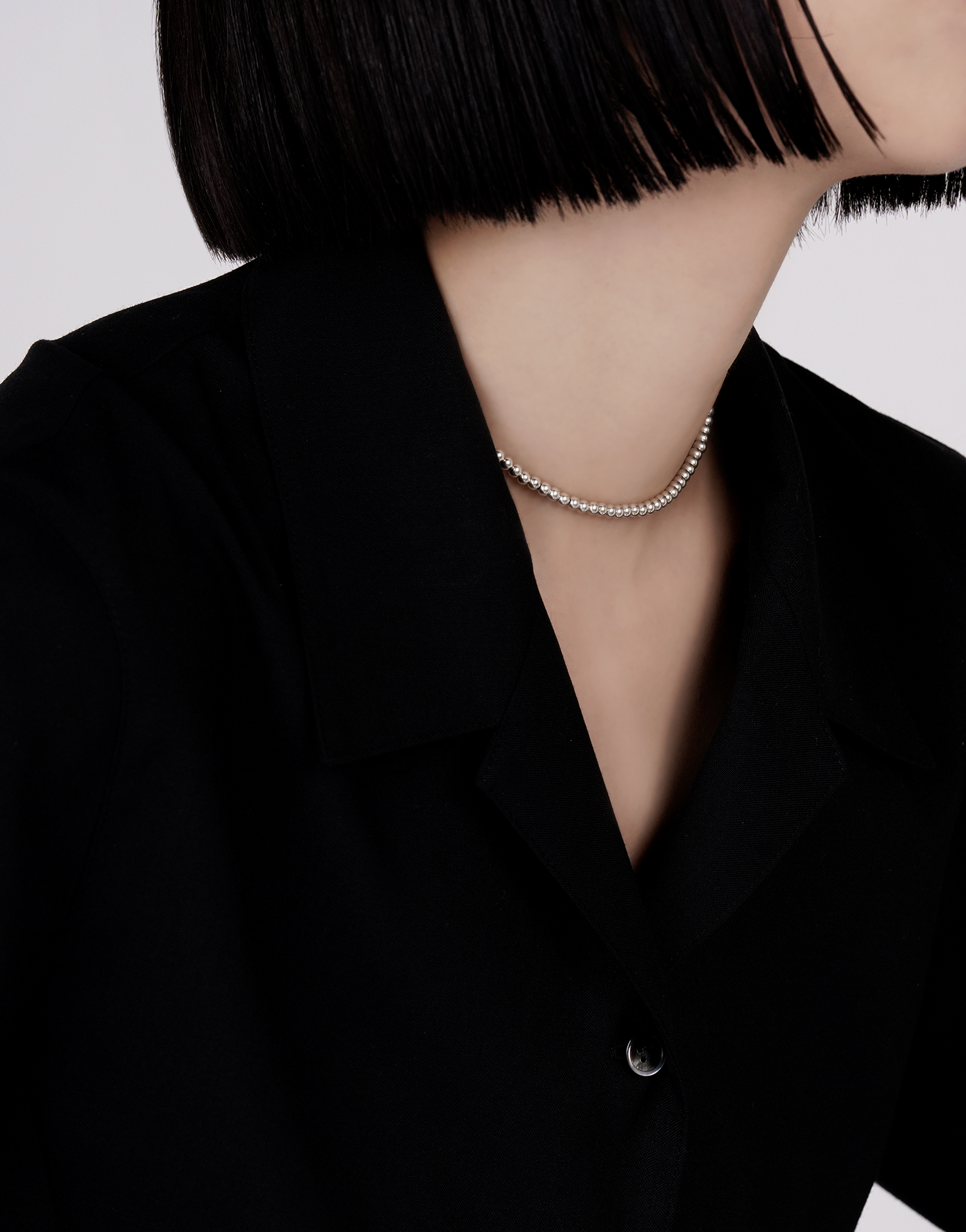 シンプルなボールのチョーカーネックレス。フック部分は牙からインスピレーションを受けており、シンプルと調和する個性があります。フック部分を前に持ってきていただいてデザインを見せるつけ方もおすすめです。 全長350mm