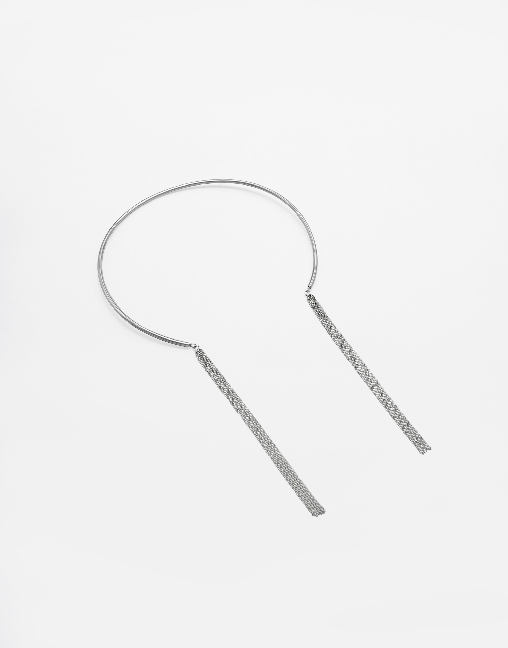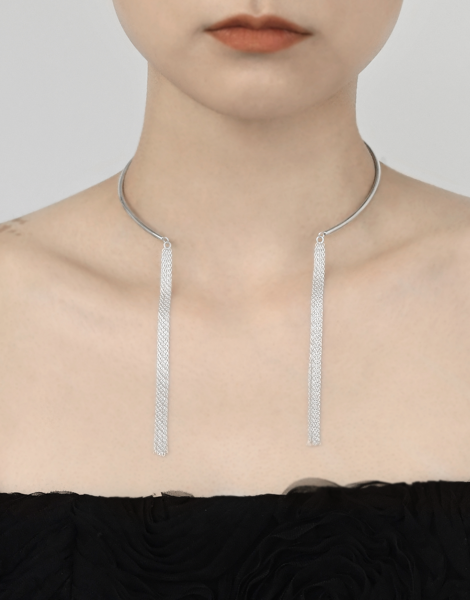 チェーンが揺れるチョーカー。前後を逆にしてチェーンを背中側に垂らすコーディネートもおすすめです。オケージョンはもちろん、日常使いにも溶け込むデザインです。
